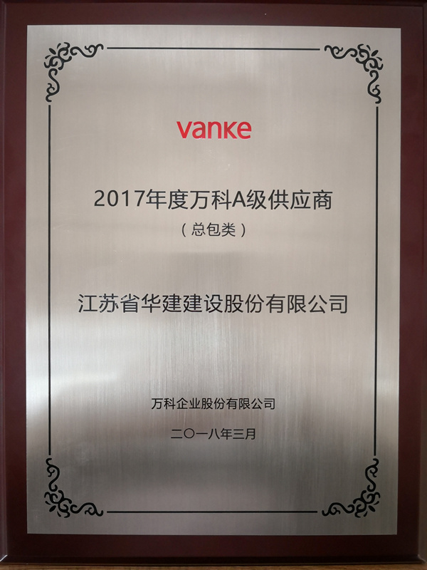 公司被萬科集團評為總包類2017年度萬科A級供應商 時間:2018-03-24 3300 3月16日下午,江蘇華建董事長王宏、北京分公司總經理呂進和北京分公司四處主任朱建奇應邀參加萬科集團舉辦的合作伙伴春茗會。會上,江蘇華建被萬科集團評為總包類2017年度萬科A級供應商,呂總代表江蘇華建上臺領取了榮譽獎牌。