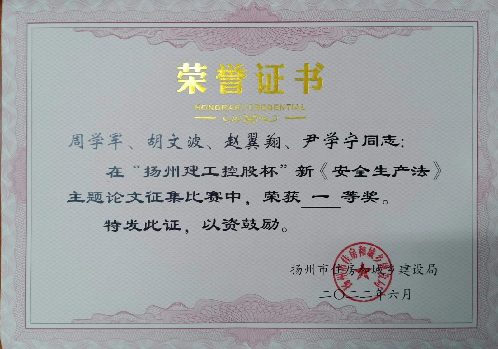 北京分公司4篇論文獲揚州市新《安全生產法》主題論文征文比賽獎項 時間:2022-07-16 3797 近日,從揚州市住房和城鄉建設局傳來喜訊,由北京公司投稿的4篇論文榮獲“揚州建工控股杯”新《安全生產法》主題論文征文比賽獎項,并獲頒證書,其中一等獎一項,三等獎一項,優秀論文獎兩項。