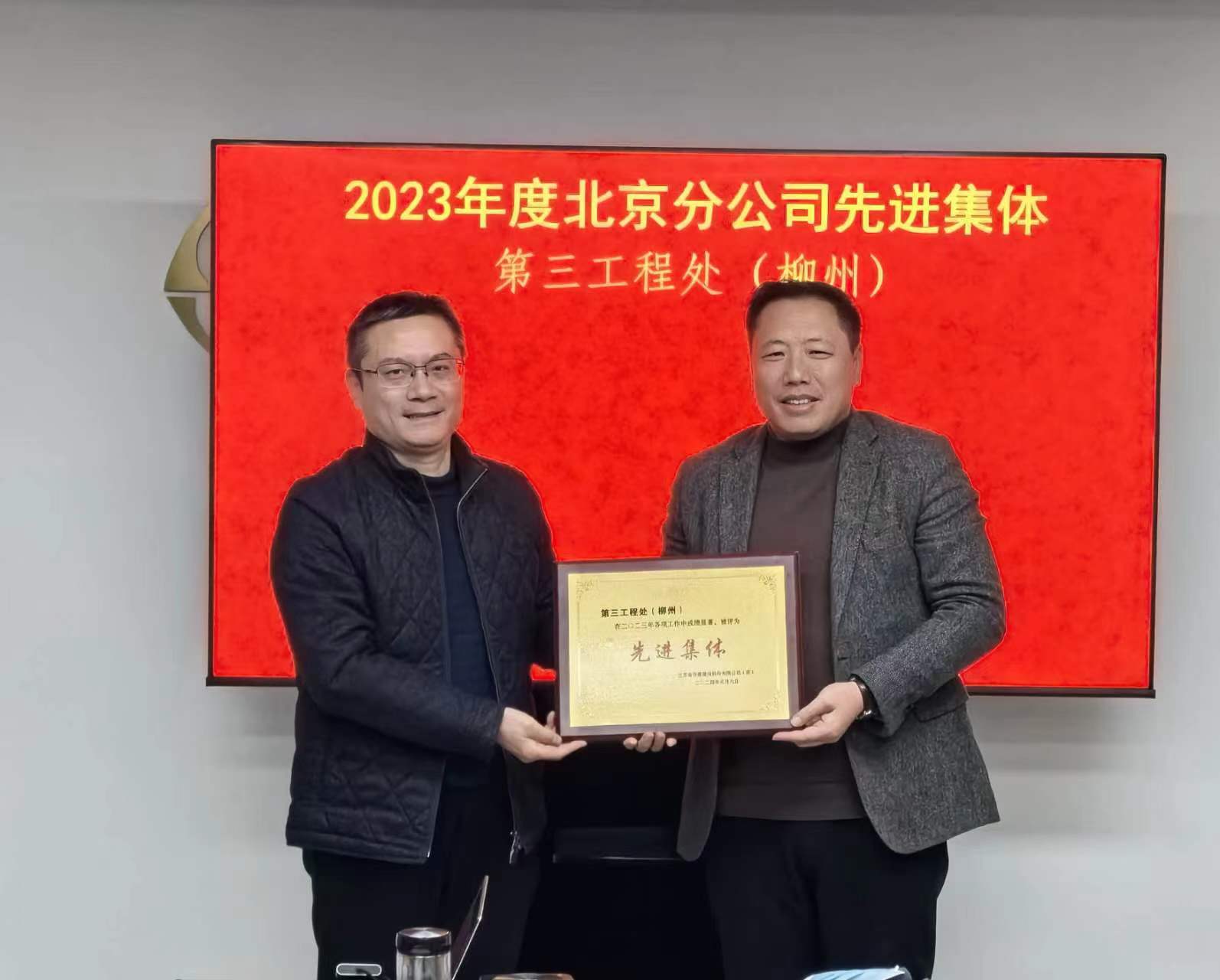 副總經(jīng)理陳永明宣讀關于表彰公司2023年度先進集體和先進個人的決定,戴壯民、朱靖為獲獎工程處代表進行頒獎并合影。