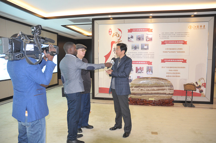 客人在陸董事長(zhǎng)陪同下參觀了華建展示中心,簡(jiǎn)單的午餐后在會(huì)議室進(jìn)行了交流與會(huì)談。陸董事長(zhǎng)首先介紹了華建的基本情況,特別是打造“三個(gè)共同體”以及與員工和合作方分名、分利、分未來的運(yùn)營(yíng)機(jī)制,最后希望能夠借助我國(guó)“一帶一路”戰(zhàn)略與海山國(guó)際聯(lián)合共同參與安哥拉的城市建設(shè)。安方用PPT介紹了2013-2017年的遠(yuǎn)期發(fā)展規(guī)劃和首都羅安達(dá)近期的發(fā)展設(shè)想,希望江蘇華建這樣有實(shí)力的中國(guó)國(guó)有企業(yè)積極到安哥拉拓展市場(chǎng)。陸董事長(zhǎng)最后還接受了安哥拉國(guó)家電視臺(tái)隨行記者的采訪,并與科魯茲·內(nèi)圖秘書長(zhǎng)、巴依相·朱紐主席等貴賓親切合影。