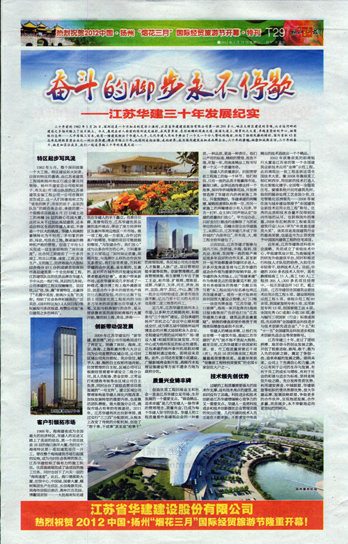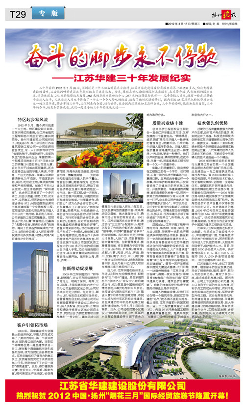 《揚州晚報》專版刊發公司三十周年宣傳文章 時間:2012-04-19 5948 4月18日,《揚州晚報》T29版刊發專版文章《奮斗的腳步永不停歇——江蘇華建三十年發展紀實》,從公司起步、市場開拓、創新發展、質量與科技等各個層面,介紹了公司三十年的奮斗歷程、綜合實力和發展業績。