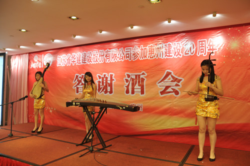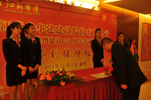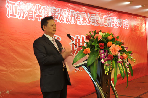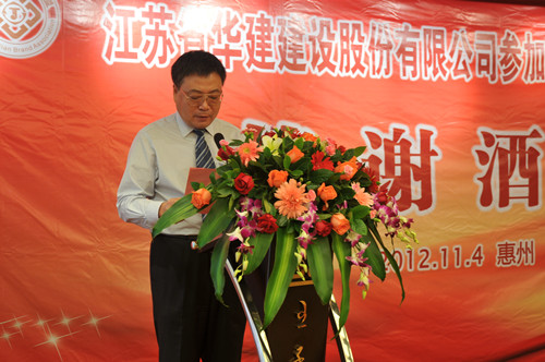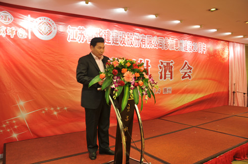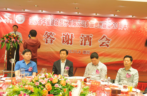 11月4日,公司在惠州隆重舉辦參加惠州建設20周年答謝酒會,副董事長、總經理宗有農主持并作開場致辭。惠州市有關政府部門、部分合作方企業的負責人,華建聯盟成員單位負責人,公司董事、監事和高管等130余人出席酒會。惠州公司總經理華恒榮介紹了公司參加惠州建設二十年的有關情況。惠州市工商聯主席、恒宇實業發展公司董事長楊滿芳代表合作方發言,惠州市住房和城鄉規劃建設局副局長陳訓政代表政府主管部門致辭,分別對江蘇華建進惠施工二十周年表示祝賀。公司董事長陸金龍代表總部對惠州市有關政府部門、相關合作方和社會各界人士給予公司的關心和支持表示誠摯的感謝,并表達了進一步加大支持力度、加強戰略合作、加快科學發展的意愿。