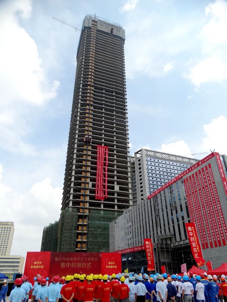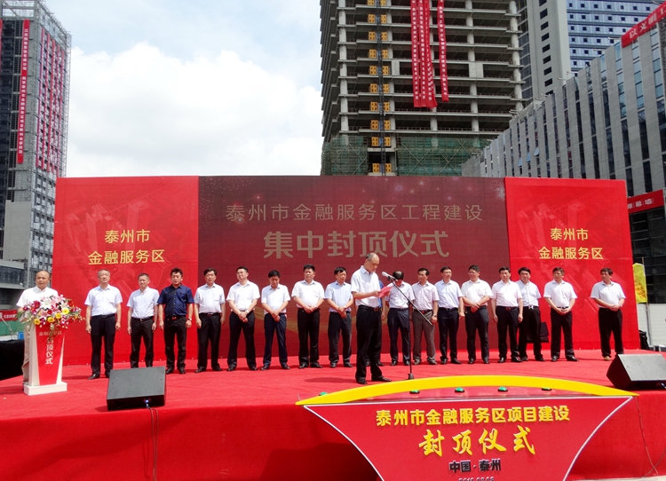 8月8日上午9時58分,泰州金融服務區工地鞭炮齊鳴,由江蘇華建承建的“蘇中第一高樓”:高達248米的泰州金融服務區6號樓成功封頂,封頂儀式上,公司副董事長陳榮春代表施工方進行了發言。