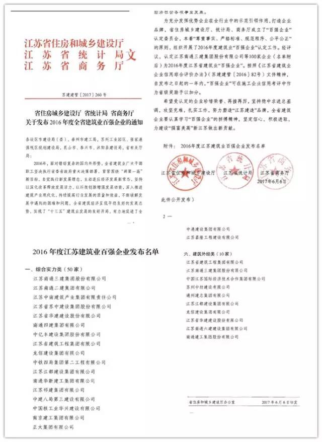 近日,江蘇省住房和城鄉(xiāng)建設(shè)廳、江蘇省商務(wù)廳、江蘇省統(tǒng)計(jì)局聯(lián)合發(fā)布了“2016年度全省建筑業(yè)百?gòu)?qiáng)企業(yè)”榜單,江蘇華建位列綜合實(shí)力類第5名。