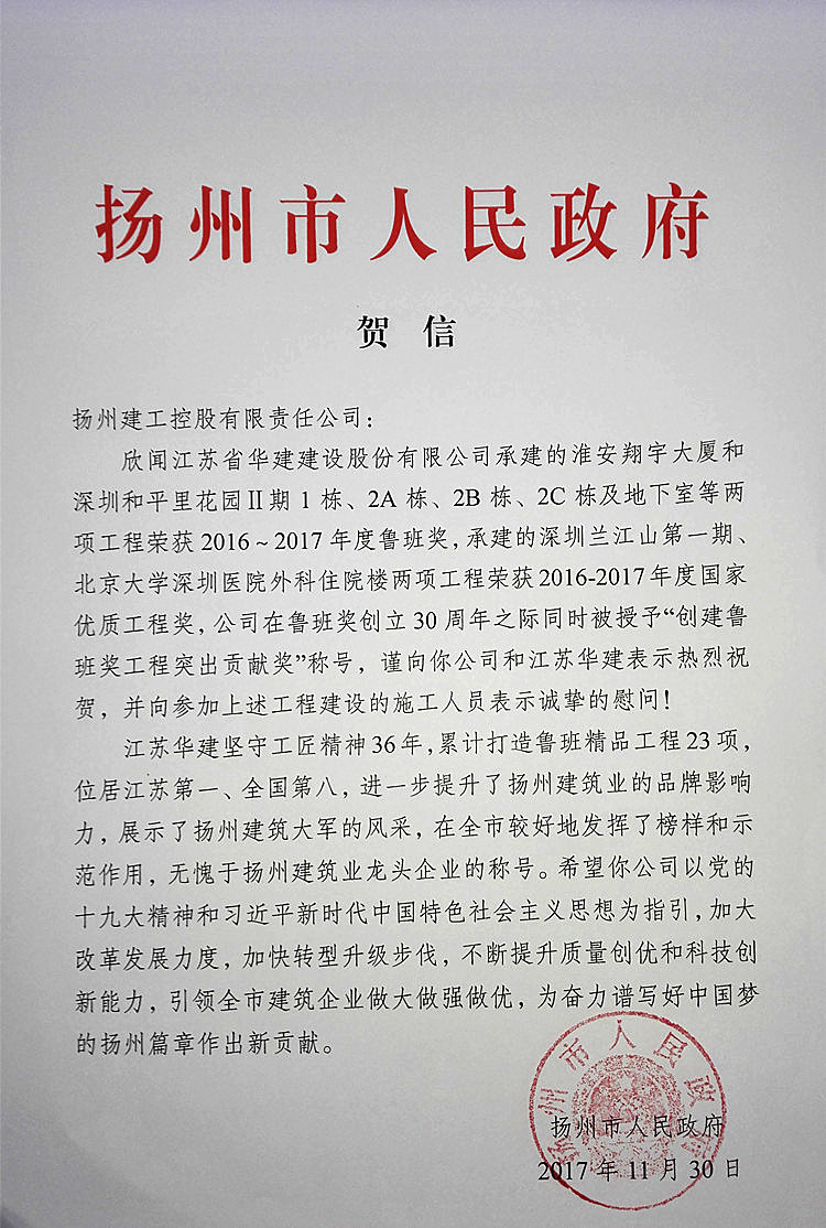 11月30日,揚州市人民政府專門發來賀信,對公司承建的淮安翔宇大廈、深圳和平里花園Ⅱ期1棟 、2A棟、2B棟、2C棟及地下室兩工程榮獲2016-2017年度魯班獎;深圳蘭江山第一期、北京大學深圳醫院外科住院樓兩工程榮獲2016-2017年度國家優質工程獎,以及在魯班獎創立30周年大會上被授予“創建魯班獎工程突出貢獻獎”稱號,表示熱烈祝賀,并向參加上述工程建設的施工人員表示誠摯的慰問。