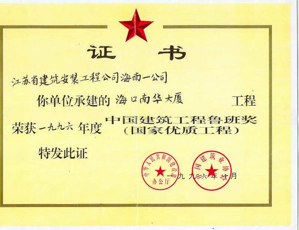 海口市南華大廈工程于1994年5月竣工,1995年6月被評為海南省優質樣板工程,1995年12月被評為建設部優質樣板工程,1996年10月榮獲魯班獎。