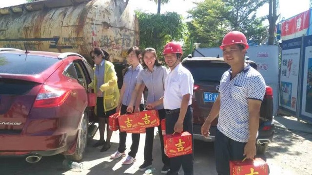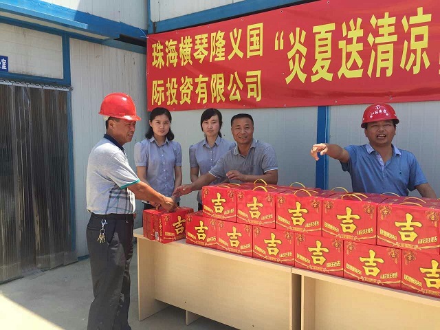 炎炎夏日送清涼 時間:2016-08-01 4080 7月30日上午,珠海分公司橫琴隆義廣場項目部工地熱浪朝天,機聲隆隆,人來人往,一派繁忙景象。一支由江蘇華建直五項目部和橫琴隆義投資公司共同組成的“送清涼”小分隊也在工地上奔忙著,項目經理姚寧與投資公司負責人王艷、許珂等正在將一箱箱王老吉飲料有條不紊地送到建筑工人手中,讓廣大一線職工在炎炎烈日下感受到陣陣清涼。