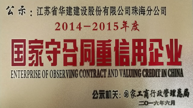 公司榮獲國家級“守合同重信用”企業稱號 時間:2016-08-02 3022 日前,國家工商行政管理總局向社會公示2014-2015年度“守合同重信用”企業名單,珠海公司榮獲國家級“守合同重信用”企業稱號。 珠海市共計13家企業被國家工商總局表彰為2014-2015年度“守合同重信用”企業,其中新上榜企業4家。榮獲該稱號充分展現出江蘇華建在珠海市場守法履約的良好施工企業形象。