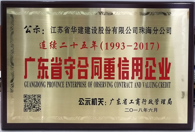 近日,珠海公司被廣東省工商行政管理局授予“連續二十五年守合同重信用企業”榮譽稱號。