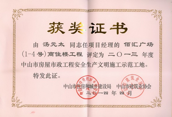 2013年度佰匯廣場商住樓工程中山市房屋市政工程安全生產(chǎn)文明...