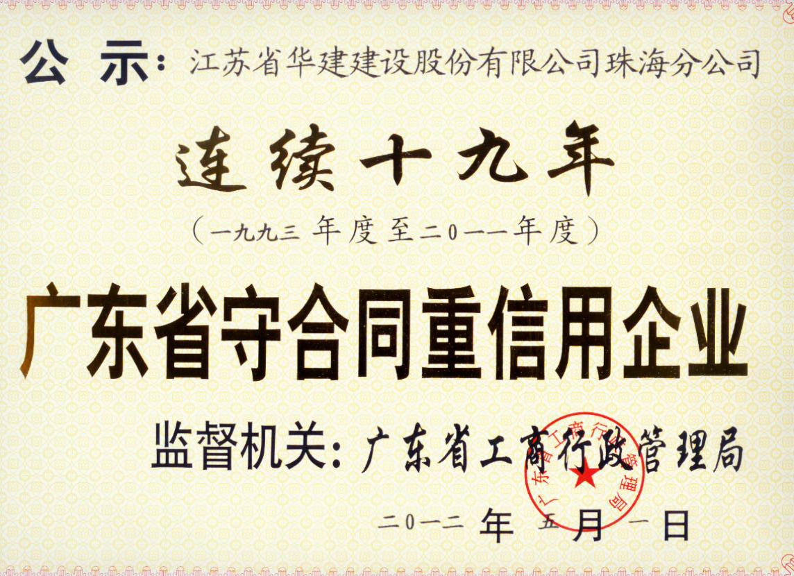 珠海公司連續19年榮獲“廣東省守合同重信用企業”榮譽稱號 時間:2012-06-28 6096 珠海公司連續19年榮獲“廣東省 守合同重信用企業”榮譽稱號 五月份珠海分公司被廣東省工商行政管理局授予“連續十九年廣東省守合同重信用企業”榮譽稱號。