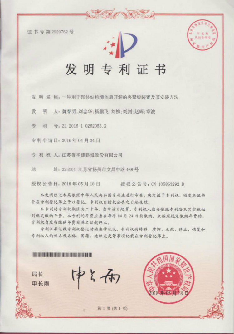 日前,從國家知識產權局傳來喜訊,江蘇華建發布的《一種用于砌體結構墻體后開洞的夾緊梁裝置及其施工方法》獲得發明專利授權(專利號:ZL20161...